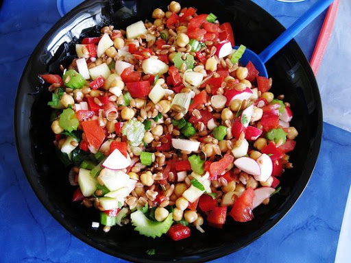 Chop up all vegetables, and place in serving bowl. Add all cooked spelt berries and 2 cups chickpeas. Mix well. Just before serving add dressing and serve.