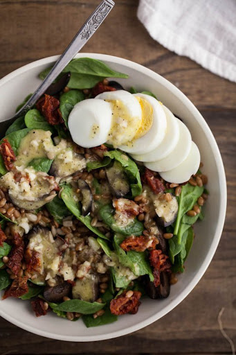 Egg, Spinach, and Spelt Salad with Green Garlic Dressing