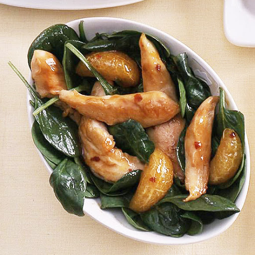 4. To serve, arrange orange sections on top of spinach. Spoon chicken mixture over oranges and spinach. Makes 4 servings.