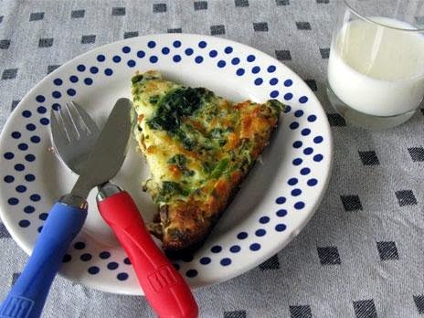 1. Sätt ugnen på 225 grader. Vispa ihop en pannkakssmet på vetemjöl, ägg, salt och mjölk. Tillsätt spenat, riven potatis och riven ost och rör om.