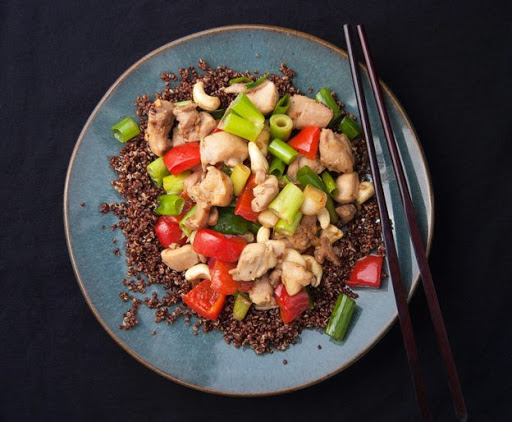 Stir the sauce mixture into the vegetables in the wok. Reduce the heat and simmer, stirring occasionally, until thickened, about 2 minutes. Stir in the raw cashews, scallion greens, and reserved chicken, along with any juices that accumulated on the plate. Serve over quinoa or wild rice (1/2 cup per person for Phase 3).