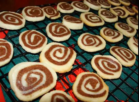 Roll it out into 6 x 16 inch rectangle into 1/4 inch thickness. Roll out both the white and the chocolate between wax paper, both sides floured first. Remove the wax paper. Invert the chocolate onto the white dough. Next, roll it up into a pinwheel, nice and tight.