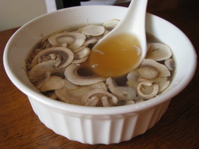 After it's cooked for at least 45 minutes strain the cooked soup and discard all of the vegetables, leaving the broth. Serve the broth with sliced mushrooms and sprinkle french friend onions over the top.