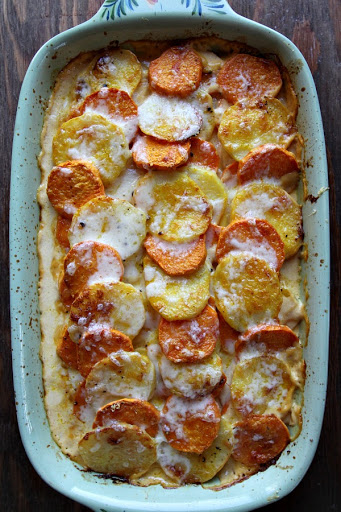 3. Create three rows of potatoes along the bottom of the dish, overlapping slightly and alternating the two types of potatoes. Sprinkle with salt and pepper. Remove the cream from heat (fishing out the thyme and garlic and discarding those) and spoon 1/3 of the cream sauce over the potatoes. Combine the two cheeses in a medium bowl. Sprinkle 1/3 of the cheeses over the potatoes too. Create a second layer of potatoes, sprinkle with salt and pepper and drizzle with 1/3 more of the sauce and 1/3 more of the cheese. Create a third layer of potatoes, sprinkle with salt and pepper and drizzle with the remainder of the sauce.
