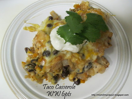Line the bottom of a large baking dish with tortilla chips, pressing down on them lightly to break them into bite-sized pieces. Spread the meat and bean mixture over the chips and top with cheese. Add sliced jalepenos or other toppings that you ant to be cooked. Bake for 20 minutes or until cheese is melted and gooey.