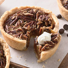 ◦To make a chocolate-y version of these mini pies, reduce the quantity of pecans to 1 cup, and divide 1 cup of semisweet chocolate chips evenly among the cups, sprinkling into the bottom of each dough-lined cup.