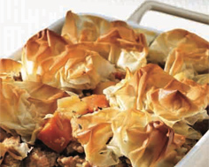 6 Lay 1 sheet of phyllo on work surface with a long side toward you. Brush all over with melted butter. Cut sheet in half vertically. Gently scrunch each piece and arrange on top of sausage mixture. Repeat with remaining phyllo sheets, arranging scrunched phyllo in a single layer and covering the sausage filling completely. Put dish on a baking sheet. Bake pie for 30 to 40 minutes or until phyllo crust is golden brown and sausage mixture is bubbling, laying a sheet of foil loosely over the dish if phyllo starts to brown too much.
