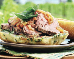 6 To assemble, carve beef into slices and divide between the 4 bottom buns. Dress each with a generous spoonful of the onions and a few fried sage leaves. Top with remaining bun halves.
