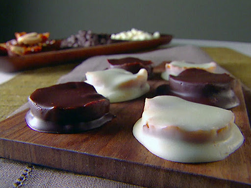 Meanwhile, melt the bittersweet chocolate in a double boiler over low heat. Wisk 2 to 3 tablespoons of cream into the chocolate to slightly thin the chocolate for coating the clusters. Dip half of the nut clusters in the bittersweet chocolate and place on a parchment paper-lined baking sheet. Return the clusters to the refrigerator to harden, about 30 minutes.