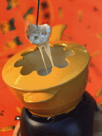 To serve, set the fondue pot on the table over a fondue burner and let diners spear pieces of bread with fondue forks and plunge them into the fondue. Remember to stir the fondue in a figure-8 pattern even when dipping your fork, to keep it from separating or sticking to the bottom.