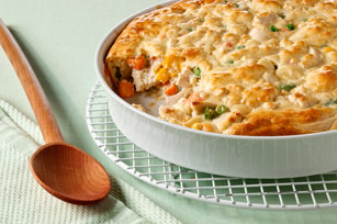 SPOON into 9-inch pie plate. Beat egg and milk in medium bowl with whisk until well blended; stir in baking mix just until moistened. Spoon over chicken mixture. Place pie plate on baking sheet.