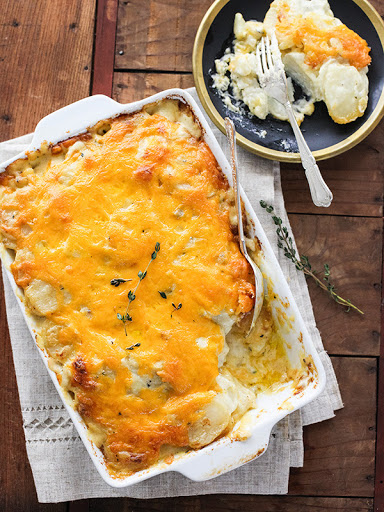 Refrigerate for an hour or up to overnight. Bake uncovered at 350 degrees for 40-50 minutes or until the cream is bubbling around the edges and the cheese is golden brown. Let rest for 5-10 minutes until serving.
