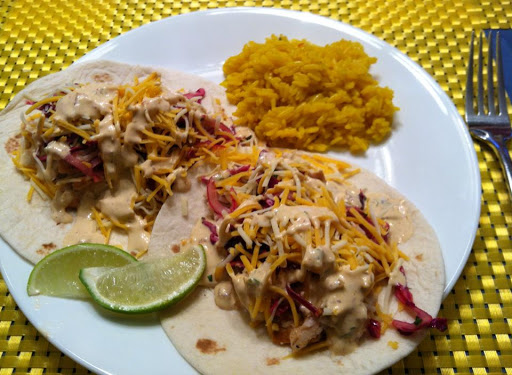 Cook the fish, preferably on the grill for 2-3 minutes per side. Cut into small cubes. Build your taco on warmed tortilla. Fish on the bottom, then the slaw, then a little spicy mayo.