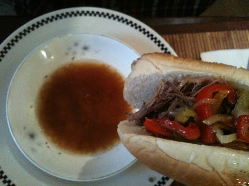 - Take sub roll, add beef and peppers and submerge into bowl.