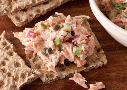 "This creamy, herbed salmon salad has flavors reminiscent of fancy tea sandwiches, but it’s a snap to prepare. Baked salmon is chilled, flaked, and mixed with crème fraîche, crunchy celery and red onion, briny capers, and fresh dill. Serve it dolloped on crackers or crostini for an elegant snack or appetizer, scooped onto a butter lettuce salad, or simply spread in a sandwich instead of tuna."