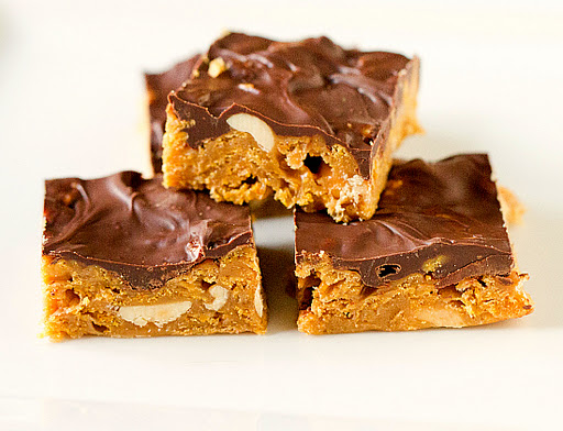 5. Microwave the chocolate chips in a bowl at 50% power in 30-second increments, stirring after each, until melted and smooth. Pour the chocolate over the cooled bars and spread into an even layer. Allow the chocolate to cool, about 15 minutes (or pop the pan back in the refrigerator to speed up the process, it’ll be set in 5-10 minutes). Using the foil overhang, lift the bars from the pan and transfer to a cutting board. Cut into squares.