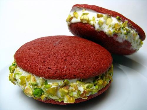 Cream the butter & sugar together until light & fluffy. Beat in the eggs. Add the buttermilk, vinegar, vanilla & food coloring and mix well. Add the flour, cocoa, baking powder, baking soda & salt & mix until throughly combined. Scoop 2-inch rounds onto a baking sheet lined with a silicon pad or parchment paper. Bake for 10 minutes, cookies will be soft. Allow to cool on the sheet for a few minutes & then move to a rack to cool completely. Chill the cookies in the freezer for at least 30 minutes before assembling sandwiches.
