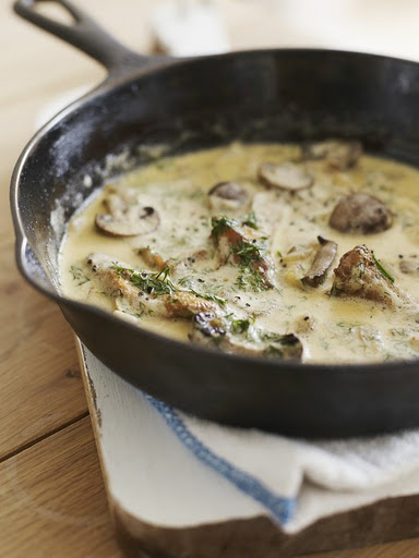 Add 1/2 cup chicken stock, 1 1/2 cup cream and 2 tablespoons chopped fresh dill.