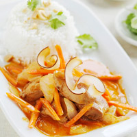3. Remove chicken from skillet. Carefully add coconut milk to skillet, scraping up crusty bits. Add carrots and lime peel. Bring to boiling; reduce heat and simmer, uncovered, for 5 minutes or until carrots are crisp-tender. Return chicken mixture to skillet. Simmer, uncovered, for 3 to 5 minutes or until liquid thickens slightly. Serve with rice, coconut curls, and snipped cilantro. Makes 4 servings.