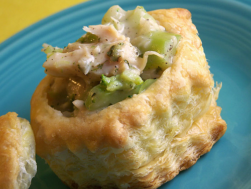*Serve* immediately over vol au vent, noodles, toast points, split baking powder biscuits or wrapped in crepes or in toast cups, below