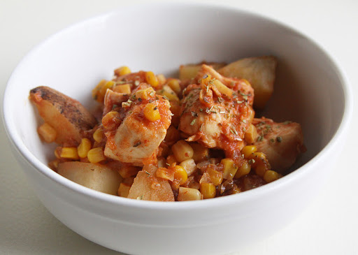 In a 4- to 5-quart slow cooker, combine all the above ingredients except for the cheese and additional dried oregano. Cook on low heat for 2 to 2 1/2 hours, or until the chicken pulls apart easily with a fork and the potatoes are tender.