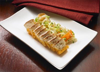 To finish, place 4 equal portions of cured vegetables on each serving plate, arranging them in a loose bundle. Assemble bread cubes into 4 equal stacks, standing bread cubes on end (like dominoes). Handling only one stack of bread cubes at a time, gently place each stack of bread cubes in the bowl of vinaigrette, allowing tomato vinaigrette to infuse only the bottom surface of the bread cubes. Layer each stack of bread cubes on serving plates along side the cured vegetables. Garnish with fennel fronds, micro herbs or baby greens if desired. Serves 4.