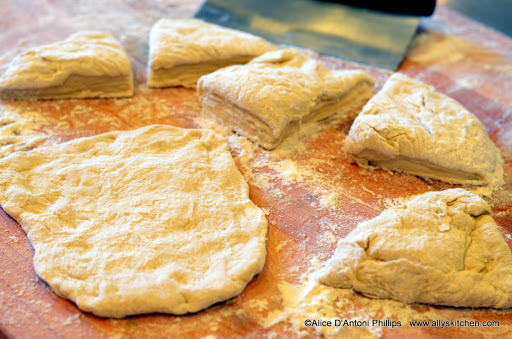 Dump the dough on a floured surface and knead (about 5-7 minutes) adding more flour to keep from sticking. Cut into pieces and flatten into irregular shapes. Place on a parchment paper covered cookie sheet and bake in a preheated 450 oven about 8-10 minutes. Remove and slather the tops with butter. Return to the oven on broil for about 60 seconds. Remove and sprinkle on sea salt.