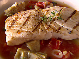 Ladle the artichoke and tomato broth into shallow bowls. Top with the grilled halibut. Serve immediately.