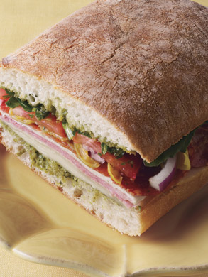 • 1 1-pound ciabatta, focaccia, or pain rustique, cut horizontally in half
