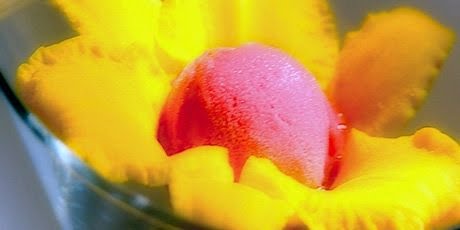 Garnish with a ball of sorbet of a colour that harmonizes well with the flower.