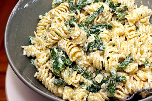 Meanwhile, combine olive oil, lemon peel, tarragon and cheese in a large bowl, breaking up the goat cheese as you put it in. Add hot pasta and asparagus to bowl, along with a couple slashes of the pasta water. Toss until smoothly combined, adding more pasta water if needed. Season genersously with salt and pepper, and lemon juice if you feel it needs a little extra kick. (We did.)