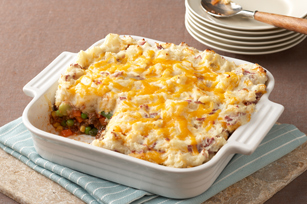 SPOON meat mixture into 8-inch square baking dish; cover with potatoes.