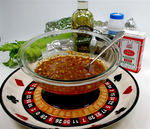 Combine el pimentón, la sal, la mostaza y la pimienta en un tazón pequeño. A continuación, alternando, añadir el aceite y el vinagre sin dejar de batir vigorosamente. Cuando estos ingredientes se mezclan muy bien, agregar el apio y la cebolla. Refrigere por una hora antes de servir. Vierta la salsa en un recipiente o contenedor con una tapa que cierre bien y refrigere hasta que esté listo para usar. Batir de nuevo justo antes de servir, si la separación se ha producido.