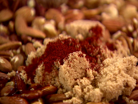 Brush a sheet pan generously with vegetable oil. Combine the cashews, walnuts, pecans, almonds, 2 tablespoons of vegetable oil, the maple syrup, brown sugar, orange juice, and chipotle powder on the sheet pan. Toss to coat the nuts evenly. Add 2 tablespoons of the rosemary and 2 teaspoons of salt and toss again.