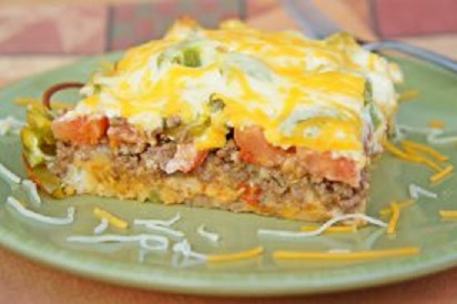 On top of biscuit mix, evenly distribute ingredients in the following order: ground beef, tomato slices, green peppers, onions, jalapeno peppers, sour cream mixture and end with remaining shredded cheese.
