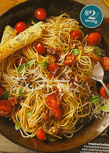 2. Add the grape tomatoes, garlic and 2 tbs oil to the skillet. Cook pasta according to package directions. Drain pasta; toss with onion mixture.