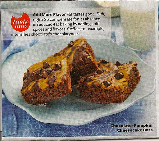 3. For cheesecake batter, in a small bowl, beat cream cheese and pumpkin until smooth. Beat in the sugar, vanilla and spices. Add egg; beat on low speed just until combined. Spoon over chocolate batter. Cut through batter with a knife to swirl the cheesecake portion. Sprinkle with chocolate chips.