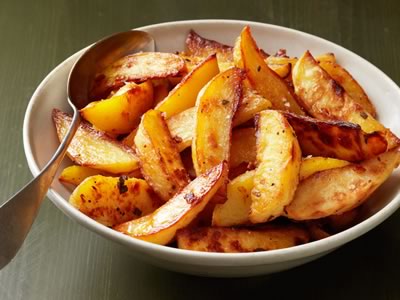 Put a baking sheet on the bottom oven rack and preheat to 375 degrees F. Peel 4 pounds Yukon gold potatoes and cut into wedges. Toss with 1/2 cup olive oil, 6 chopped sage leaves, 2 sprigs sage, 2 teaspoons kosher salt and 1/2 teaspoon pepper. Spread on the hot baking sheet and roast 30 minutes. Stir, then add 8 smashed garlic cloves; continue roasting until golden, about 30 minutes. Increase the temperature to 400 degrees F and cook until crisp, 15 more minutes. Season with salt.