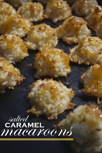 While the macaroons are cooling, prepare the caramel. Place the sugar in a small saucepan over medium heat and don’t touch it until the sugar starts to melt. It will turn clear to pale yellow and then start to darken. When it just starts to darken and boil, start stirring carefully but rapidly to fully distribute any unmelted sugar throughout the pot. Keep stirring until all the sugar is melted and there are no lumps, then turn the heat down to low and when the sugar has a nice copper color to it, add the butter. Stir in the butter and add the salt. If the mixture starts to smoke, remove the pot from the heat. When the caramel has a nice caramel color to it, remove from the heat and, using a small spoon, drizzle on top of the macaroons.