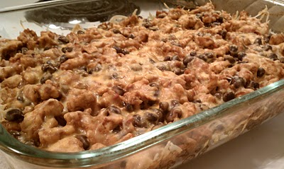 3. Break up the tortilla chips into bite sized pieces and use them to line the bottom of a 9x13 baking dish. Evenly spread the meat mixture over the chips and then sprinkle cheese over the top*. Bake for 20 minutes.
