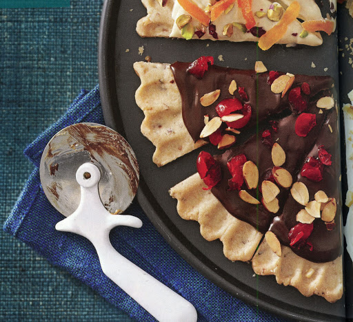 PISTACHIO-FRUIT: Spread cookie wedges with 3 ounces melted white baking chocolate with cocoa butter. Top with J/4 cup chopped pistachio nuts, 2 tablespoons snipped dried cranberries, and 2 tablespoons snipped dried apricots. Drizzle with i ounce additional melted white baking chocolate with cocoa butter: