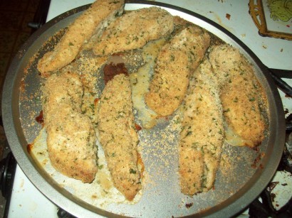 Preheat oven to 375 F. Cut the chicken breasts into large strips. Basically I cut each breast in half.