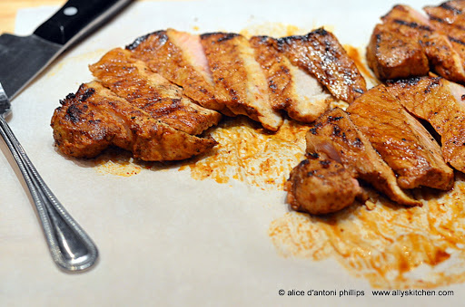 Coat a cast iron skillet well with cooking spray. Turn heat to medium high and let it get hot. Put the pork chops in (do not crowd) and cook on each side about 4 minutes varying heat flame between medium and medium high Remove to a cutting board covered with parchment paper. Deglaze the skillet with about 1/3 cup of water then pour this ‘au jus’ into a container for serving with chop if desired. Cover the chops with a lid and let rest about 5 minutes. Slice at an angle and serve.