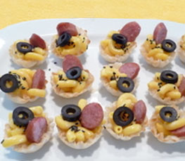Spoon macaroni cheese into each fillo shell. Place a kielbasa slice into each shell. Sprinkle with black sesame seeds and top with a black olive slice.