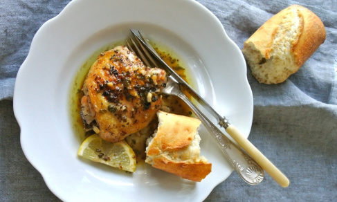 Bake chicken 35 minutes. Remove from oven. Remove chicken to a platter and drain liquid from pan. Return chicken to pan and pour lemon sauce over top. Return to oven and bake 15 minutes. Serve chicken with sauce and bread on the side for dipping.