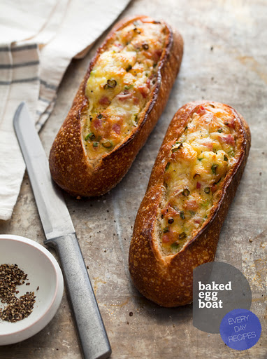 4. Divide and pour the mixture into each baguette boat and place onto a baking sheet.