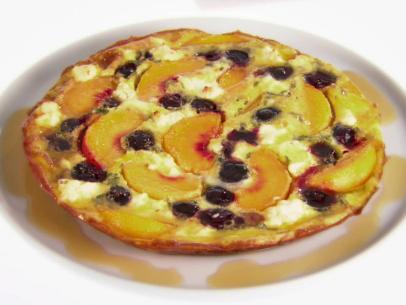 Heat the oil in a 10-inch, oven-safe, nonstick skillet (without a rubber or plastic handle) over medium heat. Pour in the egg mixture and, using a wooden spoon, carefully distribute the fruit evenly in the pan. Sprinkle the cheese over the top and cook without stirring for 5 to 6 minutes, or until the edges start to set. Transfer the skillet to the oven and bake until the frittata is slightly puffed and the egg mixture has set, 25 to 30 minutes. Cool for 5 minutes. Using a silicone or rubber spatula, loosen the edge of the frittata and slide onto a platter. Cut into wedges and serve with maple syrup.