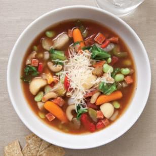 2.Add mixed soup (or stew) vegetables and lima beans. Bring to a boil over medium-high heat; boil until the vegetables are almost tender, about 3 minutes. Stir in tomatoes, pepperoni and endive (or chard); return to a boil. Adjust the heat and simmer until the endive (or chard) is just tender, about 5 minutes. Season with pepper and garnish with Parmesan, if desired.