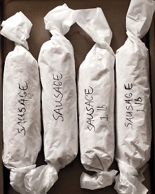 Stir together sage, thyme, salt, garlic, nutmeg, and cayenne pepper. Arrange pork shoulder, cut into 1/2-inch cubes, on a rimmed baking sheet. Freeze for 20 minutes. Working in 4 batches (1 pound at a time), grind meat in a food processor until only small pieces of fat remain, and mix in about 2 tablespoons spice mixture; transfer to an 8-by-12-inch piece of parchment. Roll into a log. Twist at ends to secure.