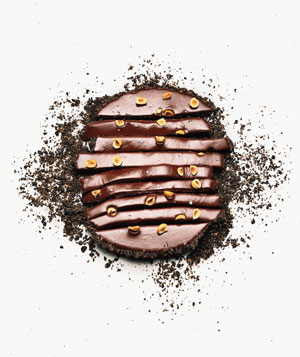In a food processor, finely grind ½ cup of the hazelnuts. Add the crushed cookies and butter and pulse until moistened. Press